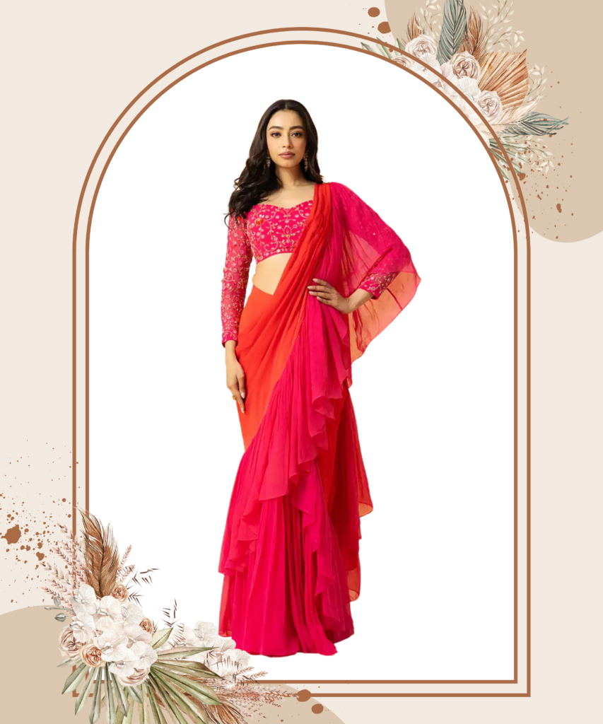 While we all know that sarees top the list when it comes to Diwali outfit ideas for women, we can’t deny that draping one requires quite a bit of skill and practice. If you still wish to adorn one, going for pre-drapped sarees Diwali look is an easy solution. Our favorite? This stylish pink and orange pre-draped saree from Quench A Thirst. Its ruffled silhouette adds that extra drama while its colorful hues paint a festive picture.