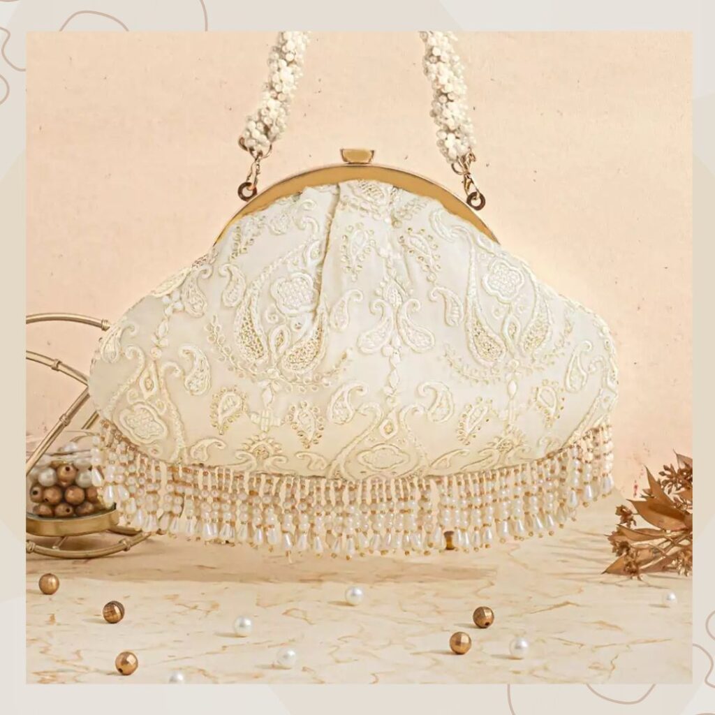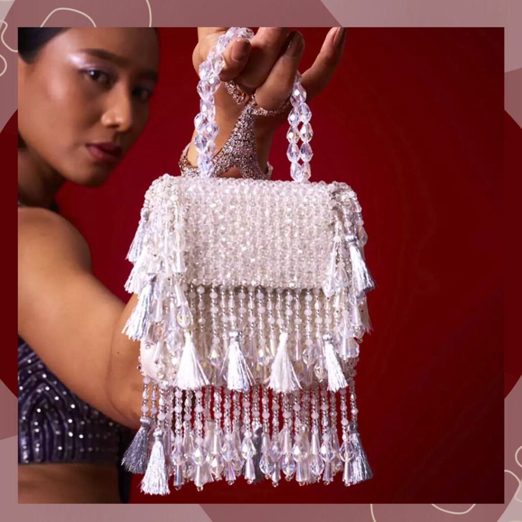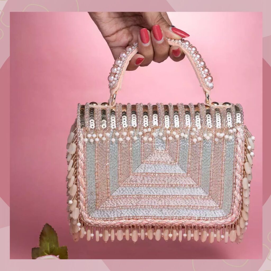 Bride handbags for wedding ideas 2025 also include handbags in soft pastel hues. Case in point– this blush pink piece from Nayaab By Sonia. It is crafted from silk and features silver sequins at the top. Further, its body is covered with pastel pink beads, and it has a stone fringe lining bordering it. It comes with a pink pearl-encrusted handle that is splendidly glamorous.