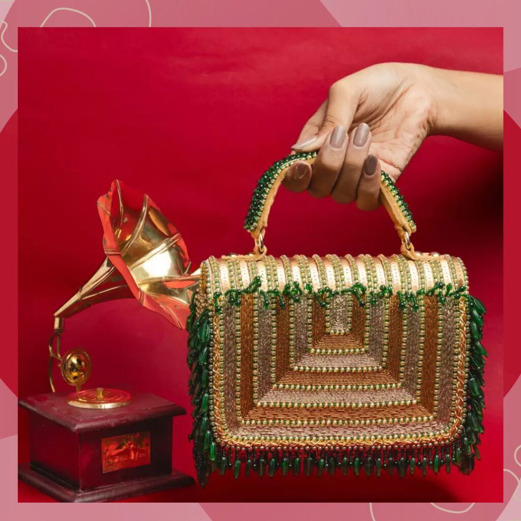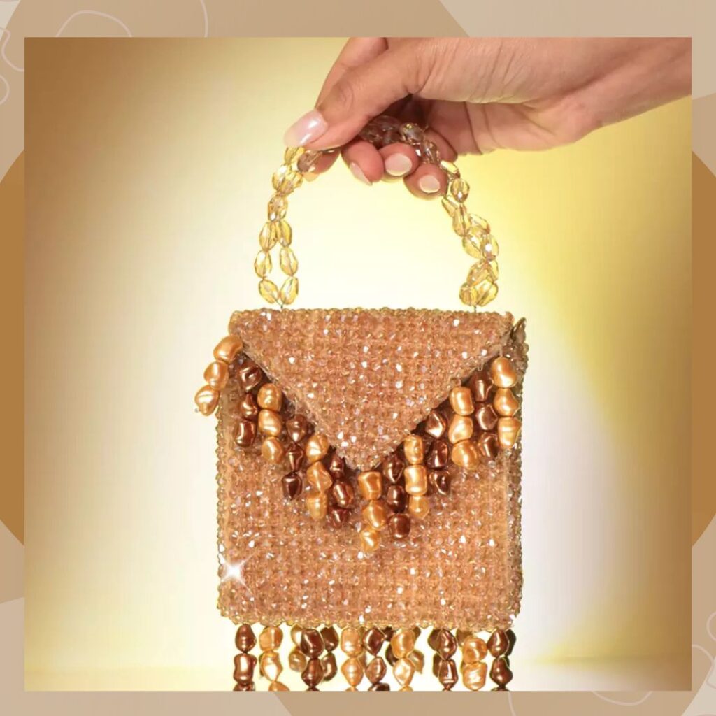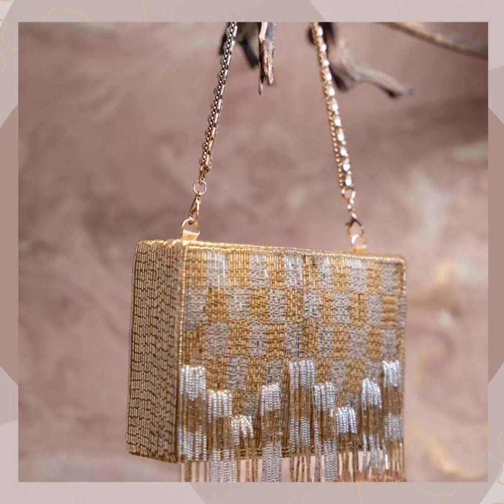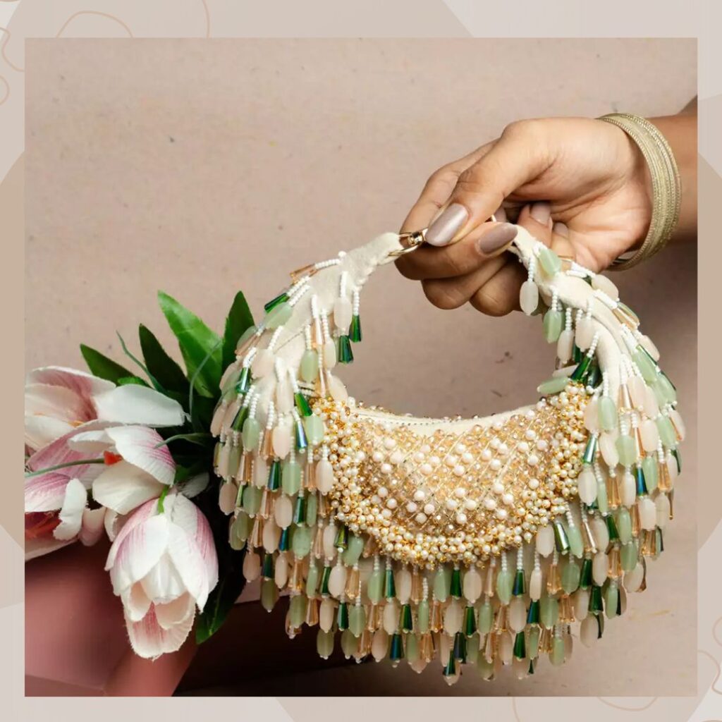 Bride handbags for wedding ideas 2025 also include handbags in soft pastel hues. Case in point– this blush pink piece from Nayaab By Sonia. It is crafted from silk and features silver sequins at the top. Further, its body is covered with pastel pink beads, and it has a stone fringe lining bordering it. It comes with a pink pearl-encrusted handle that is splendidly glamorous.