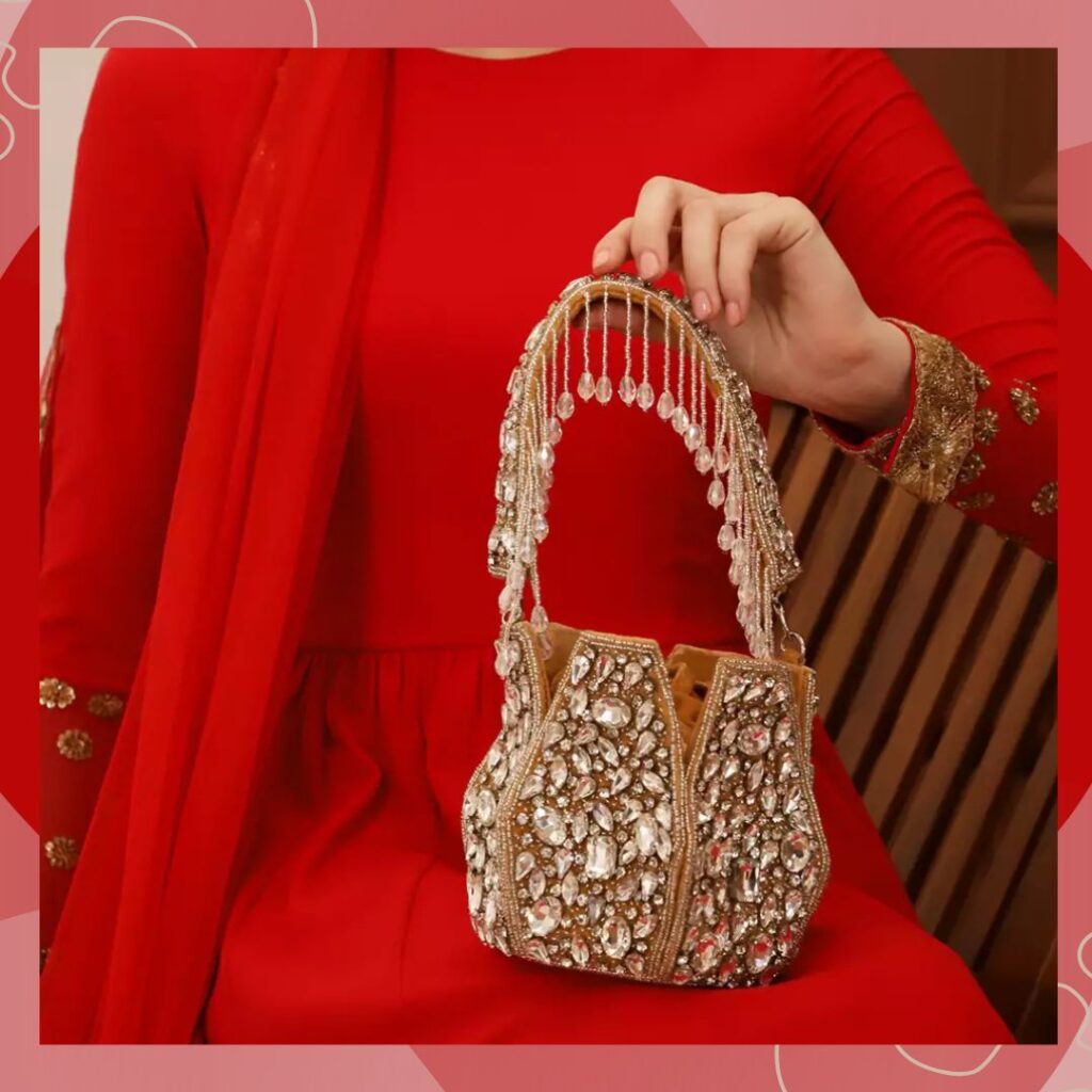 If you are on the hunt for the perfect bridal potli bags 2025, then you have to take a look at this stunner of a bag. From the brand The Tan Clan, it is a sophisticated gold in color. Its body is encrusted with white rhinestones, and its handle features a delicate beaded fringe that is the epitome of elegance. Pick this one to go with your bridal look and get compliments all evening.