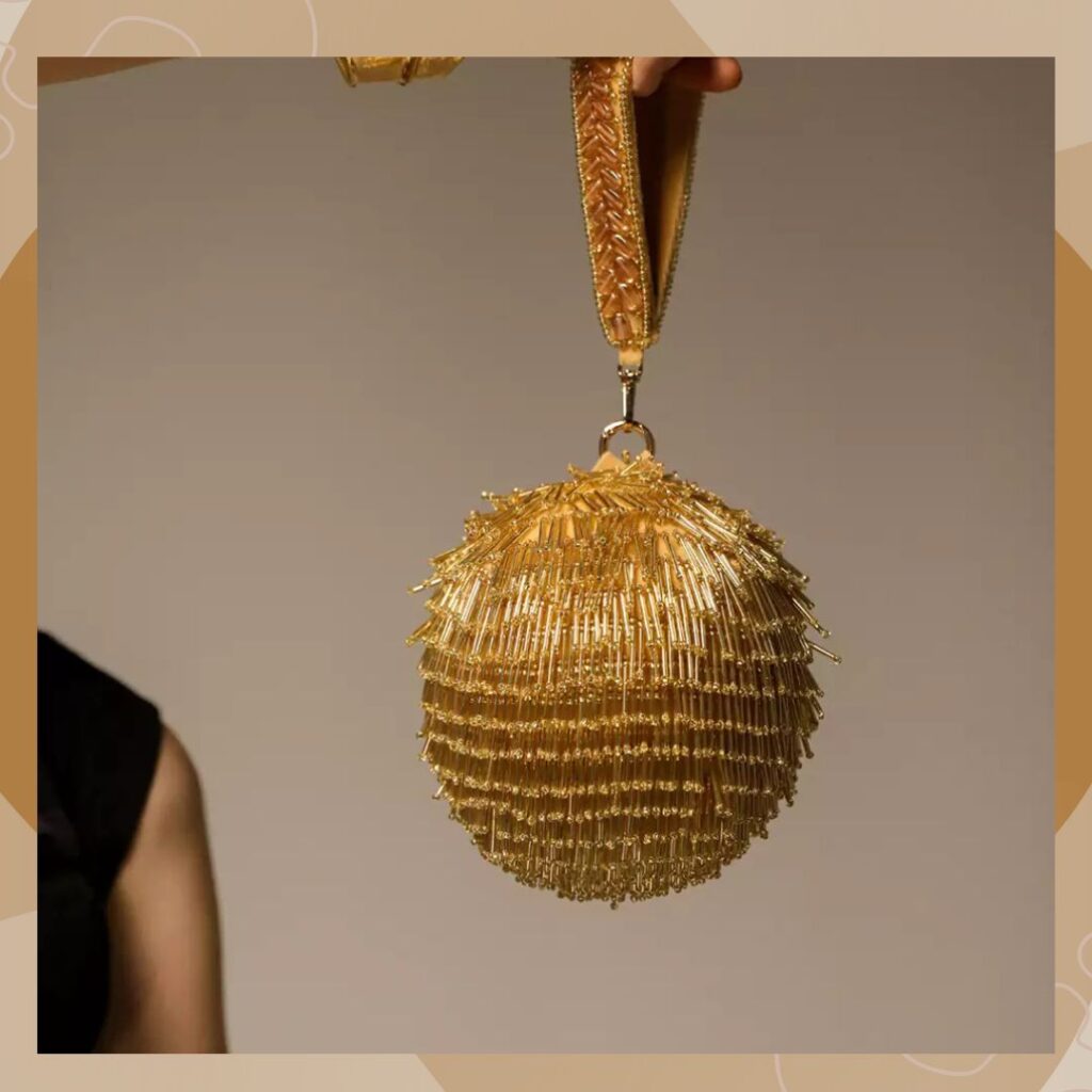 This year, bride handbags for wedding ideas include all things fresh and modern. A great example of this is this circular golden bag from Forever Noor. This stylish bag is handcrafted with precision. It further features big pipework detailing that makes it a total fashion find. You can add a modern touch to your bridal outfit with ease by picking this bag. Composed of suede, the handbag is as sturdy as it is beautiful.