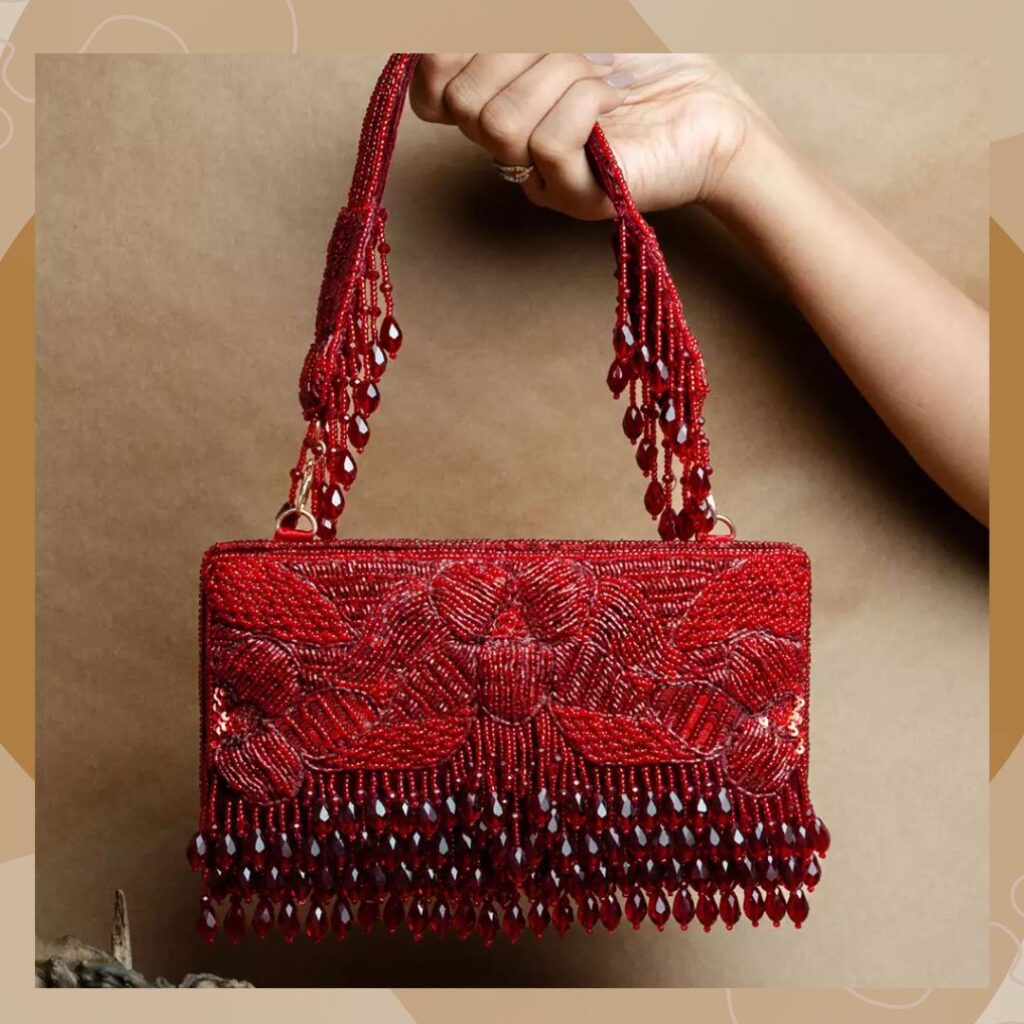 Some Indian bridal purse designs are classic and deservedly so. Take this red embellished handbag from Nayaab by Sonia, for example. It is covered in red beads of various sizes all over. It is crafted from plush velvet to give it a glamorous edge. Its handle also features beautiful hanging beads that are a treat to the eyes. Pair this one with your black bridal saree or beige lehenga to truly stand out.