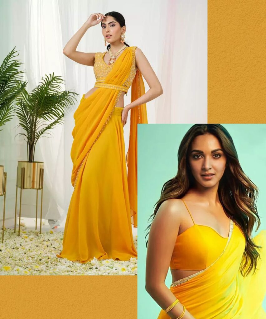 Are you looking for Bollywood saree style ideas for your haldi function? Look no further. Let this Kiara’s gorgeous look be your guiding light. She looks absolutely ethereal in a plain sunshine yellow saree and a matching strappy blouse. You can easily recreate this look by shopping for this stunning mustard yellow saree from Tamaraa By Tahani. Its shade is an exact match to Kiara’s saree, and it comes with a matching shimmering blouse as well.