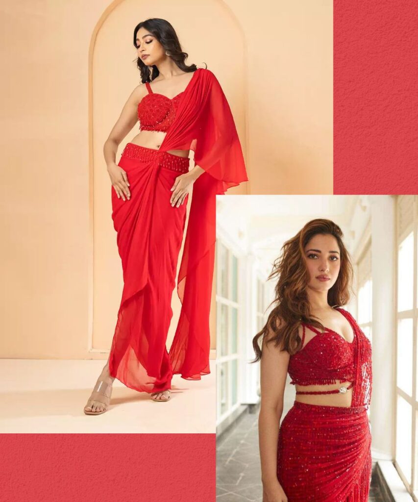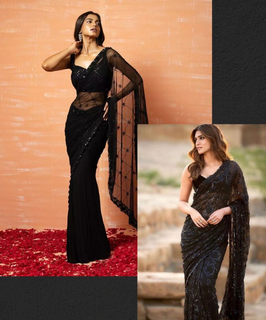 Bollywood saree style 2025 trends are all about paying homage to your favorite stars by dressing up like them. If a true glam Bollywood look is what you are after, then take a look at Kriti Sanon’s sheer black saree. You can recreate this look by trying out the gorgeous black hand-embroidered saree from Quench A Thirst. Their sheer texture and embellishments are almost identical to each other. You can either pair this lavish saree with a plain blouse like Kriti’s or a sequinned one for added drama.