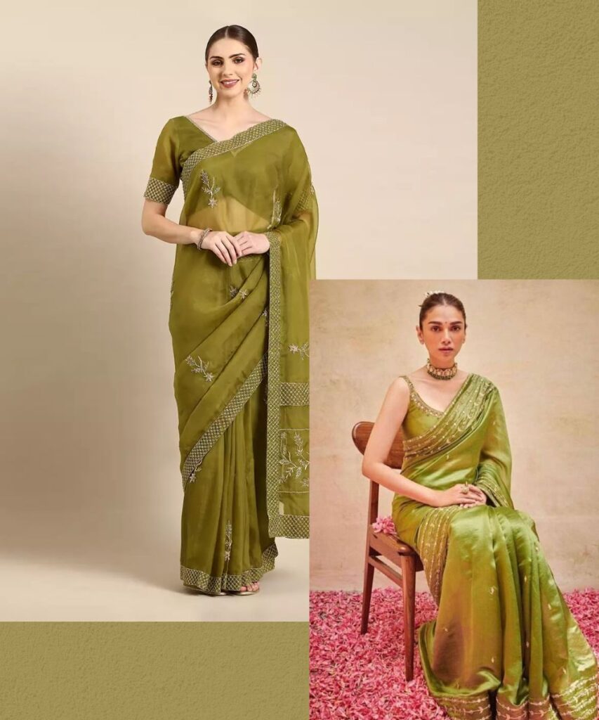 The latest saree trends in Bollywood include embracing unconventional colors like green. Aditi Rao Hydari styles this trend perfectly with her olive green saree with a golden line border. If you want to look as stylish and put-together as Aditi, take a look at Mayank Modi Fashions’ Olive green silk organza embellished saree. This saree serves old school vintage Bollywood glam with its floral embroidery. Just add in an embroidered clutch and some high heels, and your Bollywood look is ready in an instant.