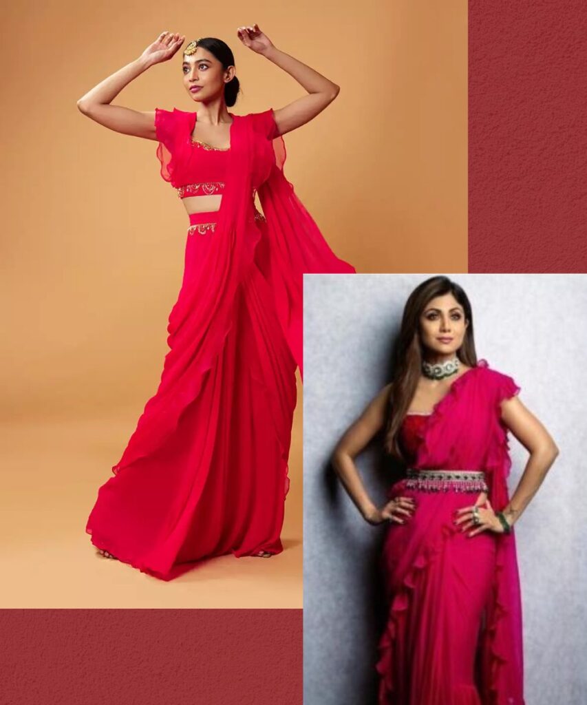 A Bollywood saree style that is our favorite is showcased beautifully by Shipa Shetty. Yes, we are talking about the glamorous ruffle saree. If you are on the lookout for Bollywood saree styles for weddings and parties, then we suggest you go the Bollywood way and recreate Shilpa’s look. You can easily do so by donning this modish Fuschia pink saree by Quench A Thirst. Channel your inner Bollywood diva at your next Diwali party with this look.