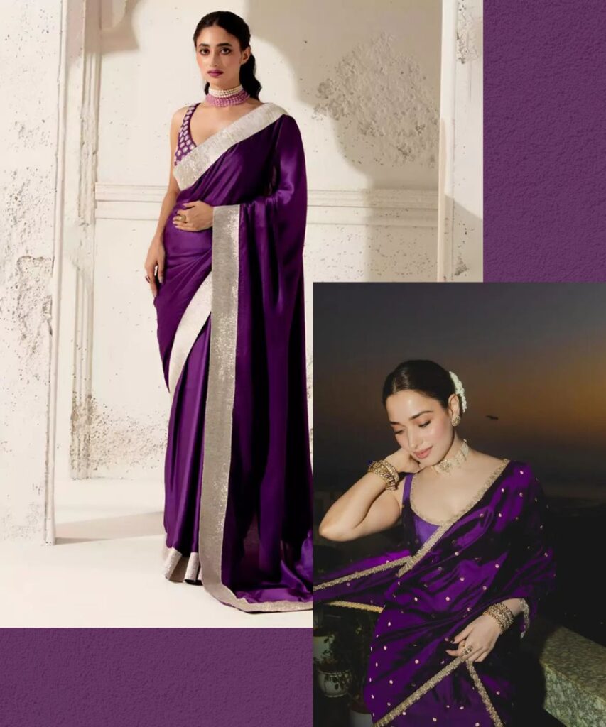 This year, the Bollywood saree style goes classic, and we can see a lot of timeless looks taking the forefront. Case in point– Tamannaah’s chic purple silk saree. It comes with a gold border and tiny gold dots covering its whole body. If you want to recreate this look, we suggest you check out this elegant purple silk saree by Ranian. Its look is plain, and it has a metallic Gota Pati border just like Tamannah’s saree.